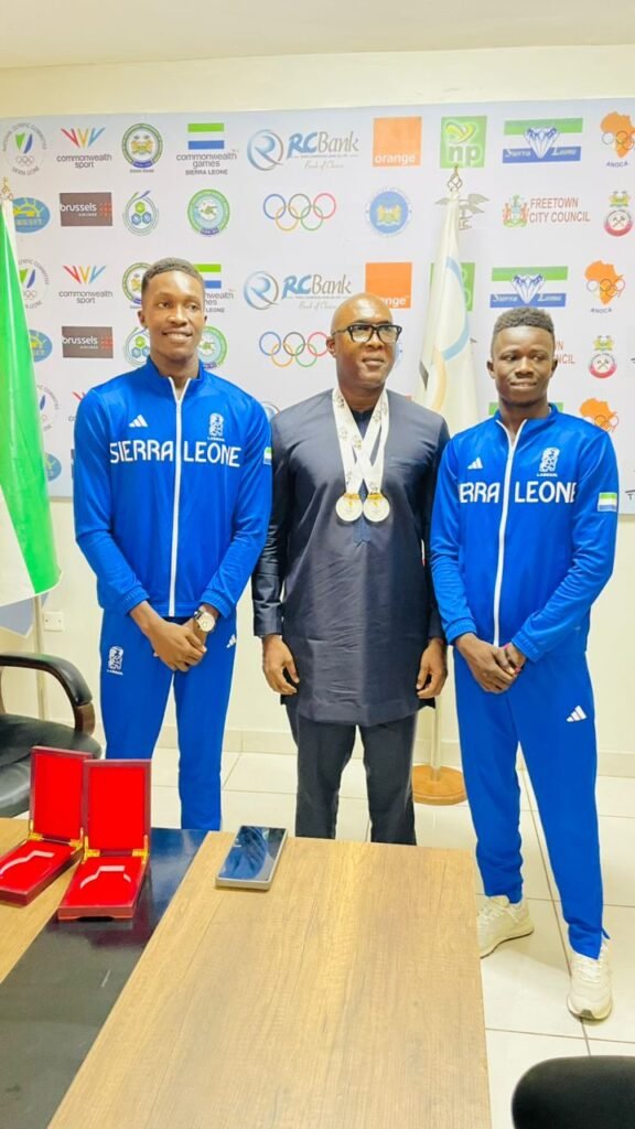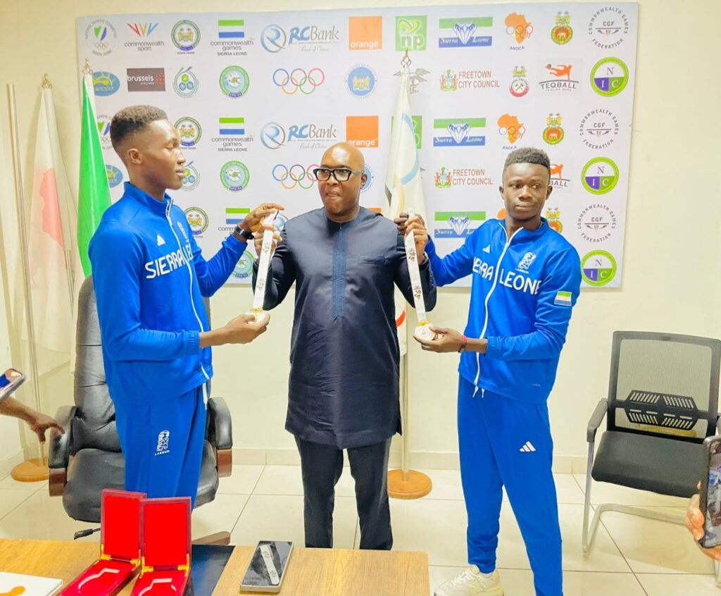 Athletes Sulaiman Bangura and Alie Kainesie presenting the Gold medal to the NOC President